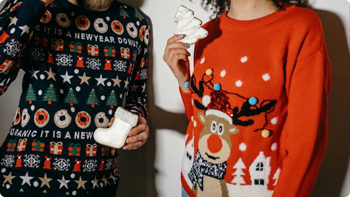 Matchande jultröjor blir pricken över i för årets bilder framför granen. Du kan också passa på att lätta upp stämningen på jobbet, i skolan eller hemma med en mer eller mindre ful jultröja.