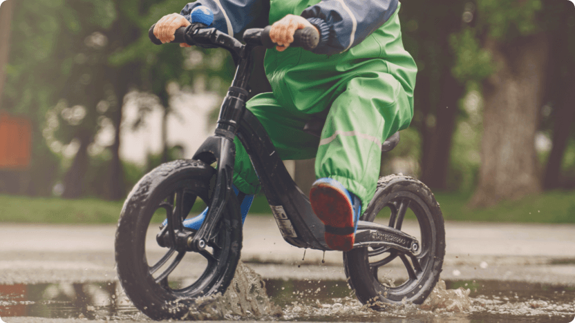 Vattentäta ytterkläder är att föredra. Plaggen måste klara av att barnen leker eller till och med sitter i vattenpölar. Begreppet vattenpelare står för hur högt tryck tyget står emot innan det släpper igenom vatten. 2 000 mm vattenpelare räcker för att ett plagg ska kallas vattentätt, men det räcker inte för att sitta ned i vatten. Sikta på plagg som har minst 5 000 mm vattenpelare, men gärna upp till eller över 10 000 mm.