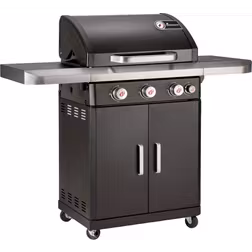 Gasolgrill, Grillvagn, Sidobord, Varmhållningsyta, Fettuppsamlare, Lock, Skåp/lådor, Hjul, Termometer, Bottenbrännare, Slutet lock