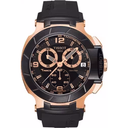 Tissot presenterar här en klocka som har ett svart armband. Det finns bland annat en datumvisare i klockan. Den har traditionella, analoga visare.